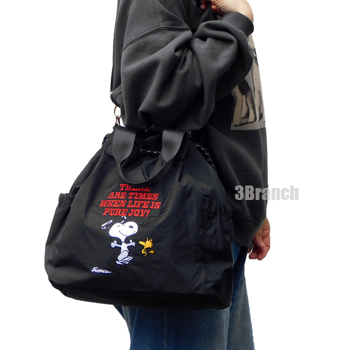 スヌーピー 75周年 2WAY ナイロン 刺繍 巾着バッグ 3 トートバッグ レディース ショルダーバッグ ドロストバッグ ドローストリング 黒 收藏