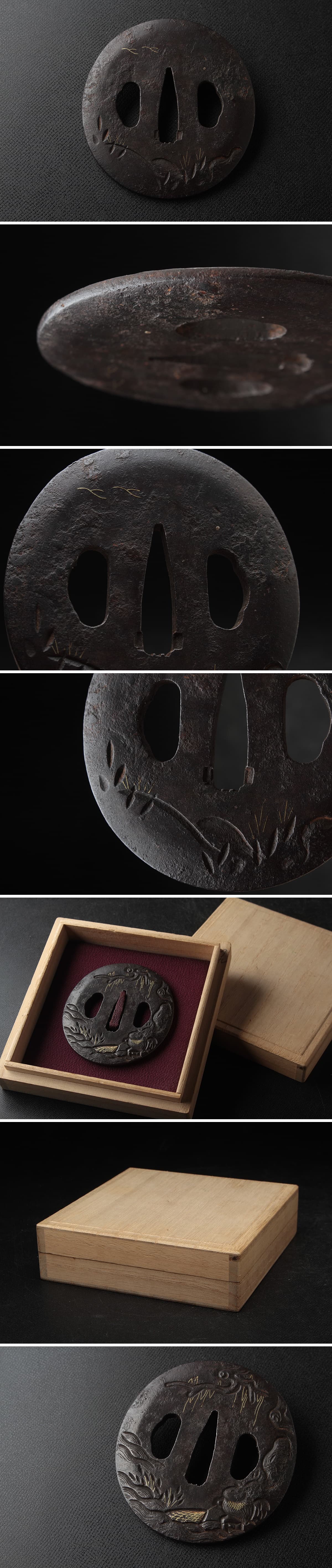 | ◆ 時代金工 鉄地 金象嵌 漁師図 丸鍔 縦7cm 木箱附・鉄象嵌鐔 古鍔 古武具 古金工 江戸 明治 刀装具 ◆
