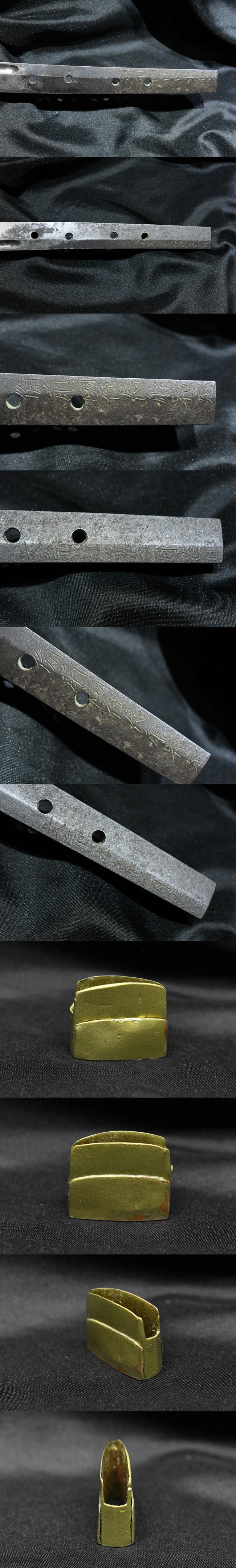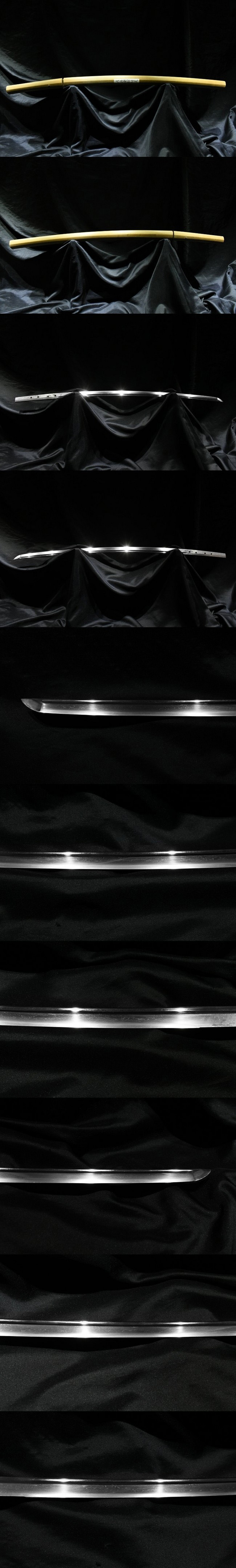 表【備前国住長船祐定】 裏【文亀三年二月吉日】 種別:刀 サイズ:長さ 65.6cm 反り: 1.8cm 目くぎ穴 4個 元幅:約 2.653cm 元重:約 0.555cm 先幅:約 1.867cm 先重:約 0.463cm 刀身重量:約 560g(ハバキ・柄をとった状態) ハバキ重量:約 15.6g 鞘全長:約 93.8cm |