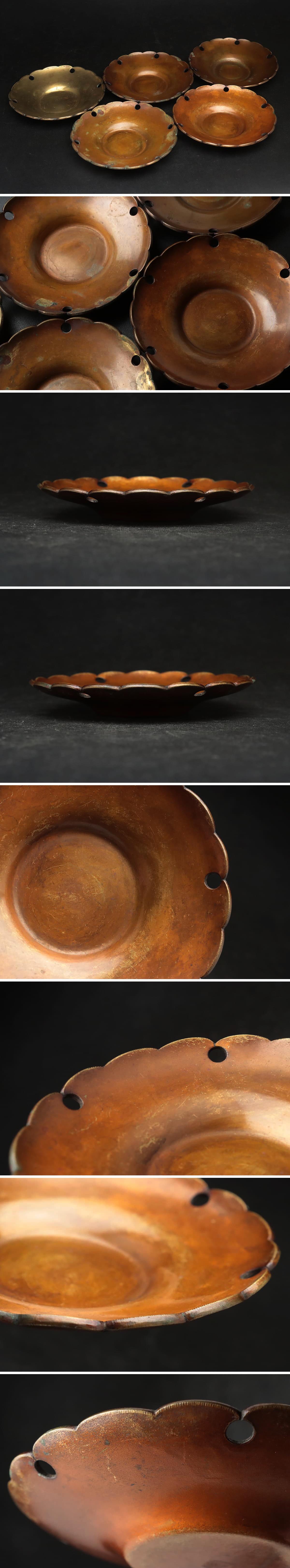 EO510 時代金工【内山大介系 寿政作】黄銅製 雪月花形 茶托 五客揃 径10.8cm 総重550g・黄銅茶托・銅托子 煎茶道具 收藏