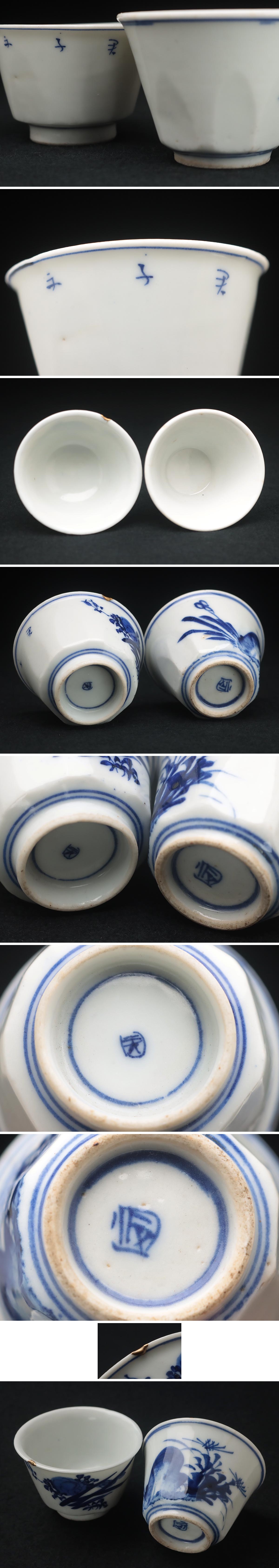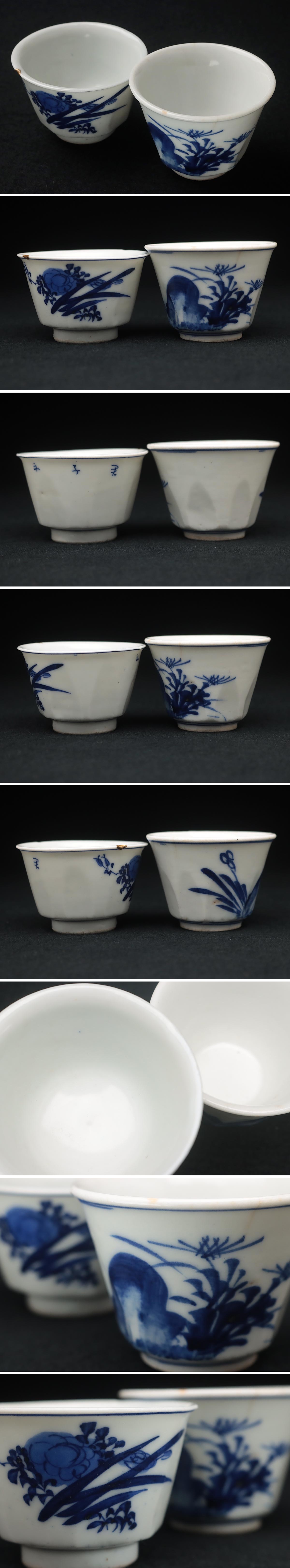 | ◆ 時代 在銘 古伊万里 染付 ぐい呑・猪口 二点「青花岩花文盃/青花四君子紋杯」酒器 煎茶碗 茶具 茶器 古美術 ◆