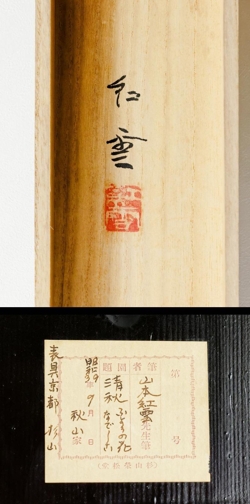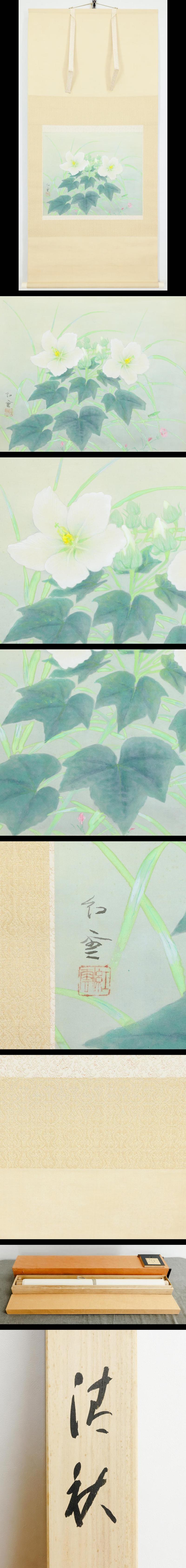 【真作】【WISH】山本紅雲「清秋」日本画 掛軸 絹本太巻 共箱二重箱 ◆やさしく咲く芙蓉撫子の清雅 〇勲四等瑞宝章 #26010004 收藏