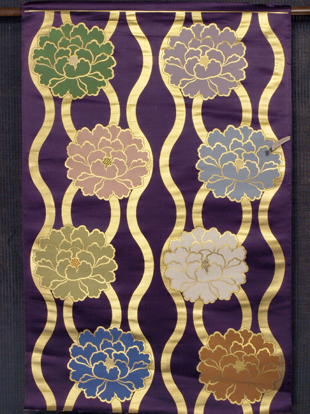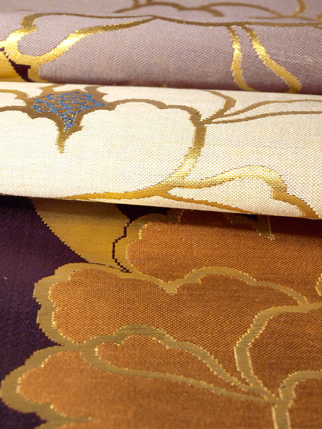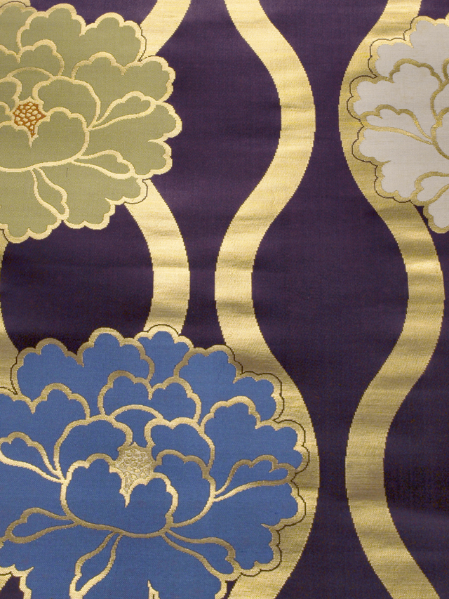 古代紫色の地に、牡丹の文様が織り込まれた、本金箔の西陣織の錦織の帯地のはぎれです。丸帯の残布と思われます。 明治末から大正期ごろにつくられたと思われるアンティークのお品です。シンプルでありながらも華やかで格調の高い雰囲気です。 残布なので未使用保管品です。目につくしみやよごれ、褪色などのダメージはなく、とてもきれいな状態です。布地の力はあります。 |