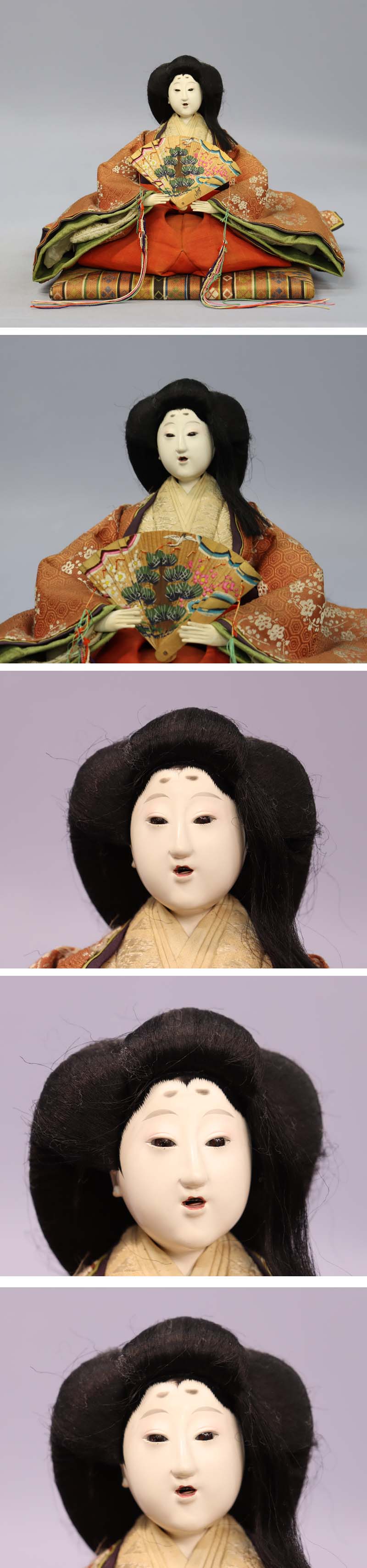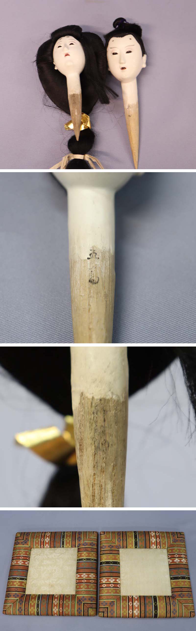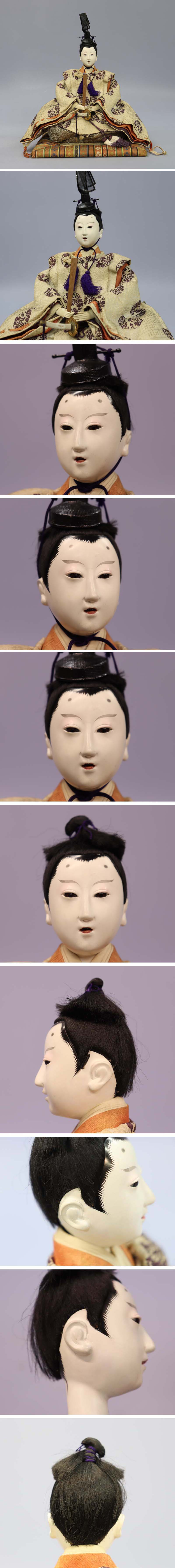 眉間、アゴ、右耳の付け根に極うすい胡粉のヒビがあります (男雛お顔アップ画像参照)。