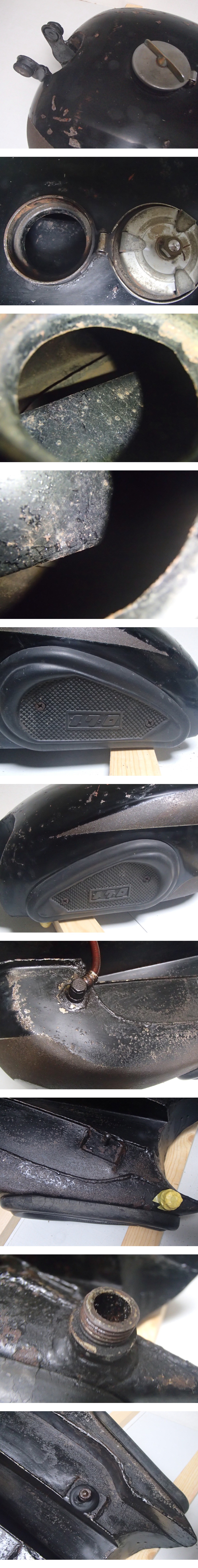 | ★商品説明★ | 【注意】商品説明欄を最後までよくご覧いただき、ご納得頂いてご入札頂けますようよろしくお願いいたします。また、商品詳細に追加写真がありますが、スマホでは表示されない可能性があります。必ずパソコンにてご確認よろしくお願いいたします。【注意】 目黒製作所製のバイク『メグロジュニア S3』に使用されていたガソリンタンクです。 写真に写っている物の出品です。写真の他に付属品はありません。 とある農家さんの納屋に車体から取り外された状態で保管されていた品です。 屋内保管でしたがかなり汚れた状態だったので、当方で灯油及びパーツクリーナーで洗浄、脱脂を行いました。 あちこちに錆や塗装剥がれがあります。特にフレーム側に取り切れない錆や油汚れがあります。 また、内部洗浄は行っていないので、内部に汚れが残っている可能性が高いです。 あくまでもジャンク扱いの現状品としてお考えください。 全体的に傷や一部深めの凹みはありますが、致命的なダメージは無いかと思います。 光で確認した限りでは、穴あきは無いようです。ただ、注水確認は行っておりません。 目視の限りですがボルトやナット、ビス部に目立つ錆や山潰れは無いようです。 エンブレムも特に割れ等はありません。 ただ、当方知識が無い為あくまでも素人目視となります。写真をよくご確認の上、ご検討ください。 通常発送の他、直接引き取りも可能です。ご希望の方は落札後に取引メッセージにてご連絡ください。商品保管場所は神奈川県横浜市泉区です。 商品の性質上、同梱発送はお受けできません。あらかじめご了承ください。 ただ、同時出品中のエンジンやギアボックスと合わせて直接引き取りは可能です。こちらもご希望の方は落札後に取引メッセージにてご連絡ください。 どうぞよろしくお願いいたします。 | |