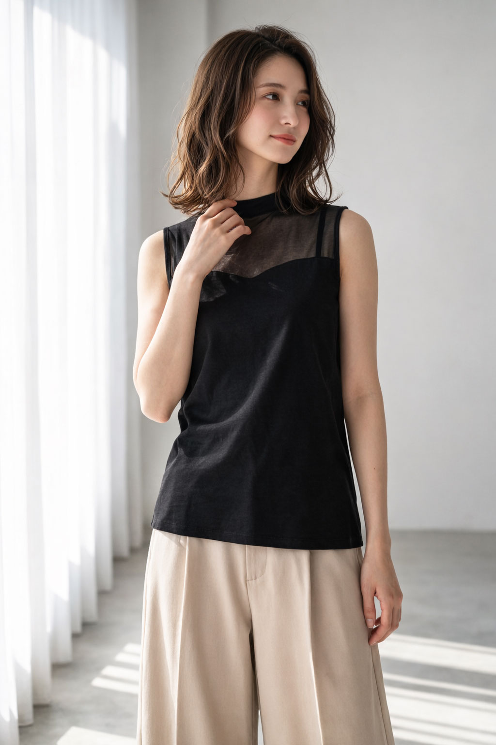 素肌が喜ぶ綿100%。首元のチュールで魅せる上品インナー。
