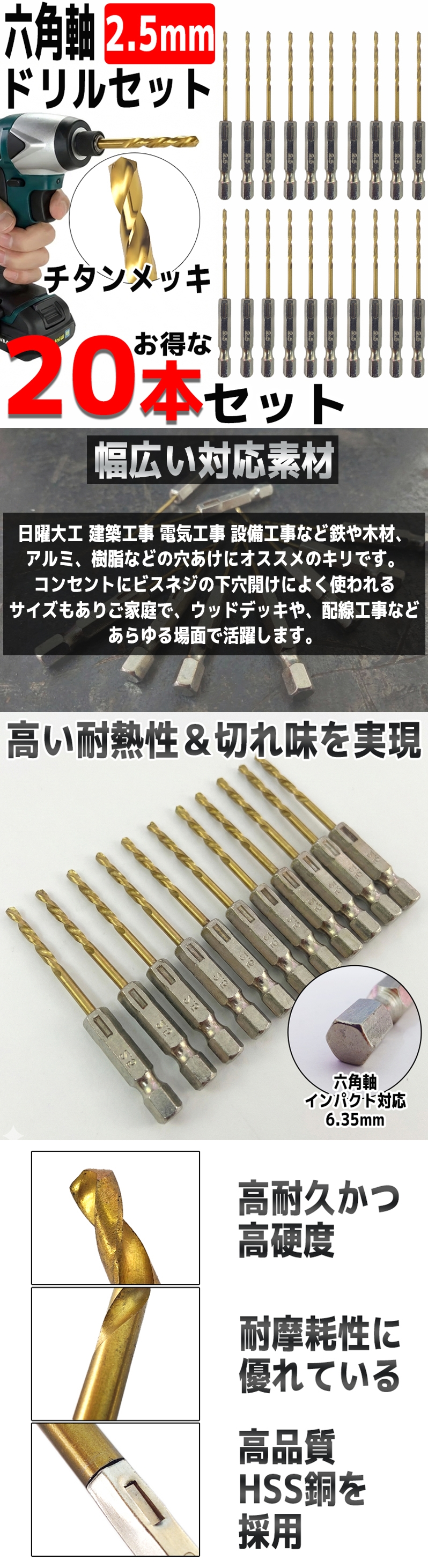 ドリルビットセット 20本セット 2.5mm 六角軸 工具 電動ドリル インパクトドライバー インパクト ドリルパーツ 穴開け工具 HSS鉄鋼用 金 收藏