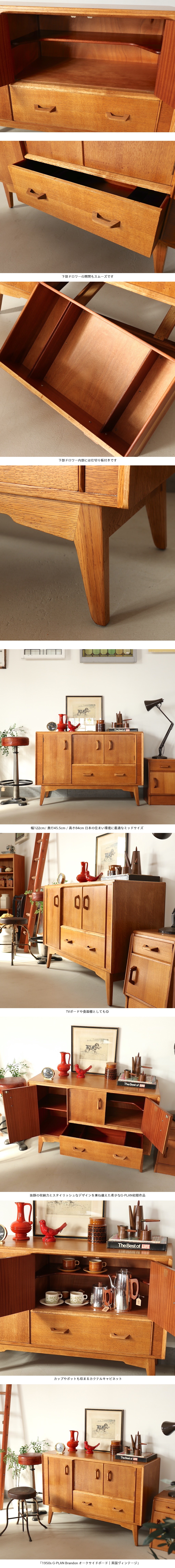 ○製造国 : イギリス ○推定年代: 1950s ○材質 : オーク材 ○サイズ : W122cm/ D45.5cm / H84cm ○配送ランク: 【 Dランク 】 ・・・・・・・・・・・・・・・・・・・・・・・・・ ■商品説明 : 1950年代にイギリスで製造された、「G-PLAN」の希少な初期シリーズ "BRANDON(ブランドン)" のオーク・サイドボード。 当店にてイギリスより直輸入後、フロント・サイド・脚部の塗装剥離~再塗装を含むフルリペアを行いました。 当時の英国家具らしい設計思想と素材選びが色濃く残る一台です。現代のリプロダクトやミッドセンチュリー風の模倣品にはない、時間を経たヴィンテージならではの風合いと存在感があります。 デザイン・サイズ・保存状態のバランスが良く、実用家具として今なお一線で使える希少個体です。横幅122cmのミッドサイズで、日本の住まい環境にも最適のサイズ感。コレクション目的だけでなく、日常使いを前提に選ばれる方におすすめです。 正面左側には縦長の収納キャビネット。右側上段は観音扉のワイドキャビネットで、もともとはカクテルキャビネットやカップボードとして使用されていました。右側下段は仕切板付きのドロワーを完備。たっぷり収納で、書籍類や食器類など、あらゆる日用品の収納に適しています。TVボードとしても活躍します。 この1950年代 G-PLAN / BRANDON サイドボードは、主張しすぎず、それでいて空間の“芯”になる家具です。 キャビネット扉の内側に、1950年代製を示すG-PLANのゴールドエンボスロゴが残っています。 白壁や漆喰壁のシンプルな空間、フローリングやモルタル床のミニマルな部屋、北欧・ミッドセンチュリーをベースにしたインテリア空間、古道具やアートを一点ずつ楽しむ暮らし、そんなお部屋に、自然に、確実に馴染みます。 オーク材の落ち着いた色味と直線的なデザインは、照明やラグ、アート次第で表情を変え、「使いながら育てていく楽しさ」を感じさせてくれます。 【 G-PLAN / ジープラン 】 G-PLAN(ジープラン)は、1950年代にイギリスで誕生した家具ブランドで、戦後英国のミッドセンチュリーデザインを代表する存在として知られています。 当時としては革新的だったスカンジナビアンスタイルのモダンデザインと高い実用性を両立し、一般家庭に「デザイン性のある上質な家具」を広く普及させました。 現在では「英国ヴィンテージ家具」を語る上で欠かせない代表格的なブランドとして、ヨーロッパのみならず世界中のコレクターやインテリア愛好家から支持され、装飾過多ではない端正なデザインと耐久性の高さから、「使うためのヴィンテージ家具」として今なお実生活で選ばれ続けています。 ■ 1950年代=G-PLAN創世記 ■ 1950年代のG-PLANは、素材・構造・デザインのバランスが最も良かった時代と言われ、中でも"Brandonシリーズ”は、後の60年代から主流となるチーク材ではなく、オーク材が使用されている希少モデルで、流行に寄りすぎない、普遍的な美しさを備えた一台。 時代が変わっても古びることなく、むしろ年月とともに味わいを増していく、本物のイギリス・ミッドセンチュリー・ヴィンテージ家具です。 ■ こんな方におすすめ ■ 「ヴィンテージ家具に興味はあるが、状態や使い勝手に不安がある」 「デザインだけでなく、実用性もきちんと重視したい」 「大量生産の家具では満足できず、背景や物語のある一点物が好き」 「“いつか買い替える家具”ではなく、長く付き合える家具を選びたい」 そんな方におすすめのミッドセンチュリー/ヴィンテージです。 当店にて塗装剥離から再仕上げまで行っているため、ヴィンテージ初心者の方にも、安心してお使いいただけます。 ◆ サイズ ◆ ○全体: W122cm / D45.5cm / H84cm ○左キャビネット内寸: W39.5cm / D42cm / H 上段27cm 下段28.5 ○右上キャビネット内寸: W81.5cm / D40cm / H 上段15.5cm 下段17.5 ○右下ドロワー内寸: W70cm / D38.5cm / H19cm ・・・・・・・・・・・・・・・・・・・・・・・・・