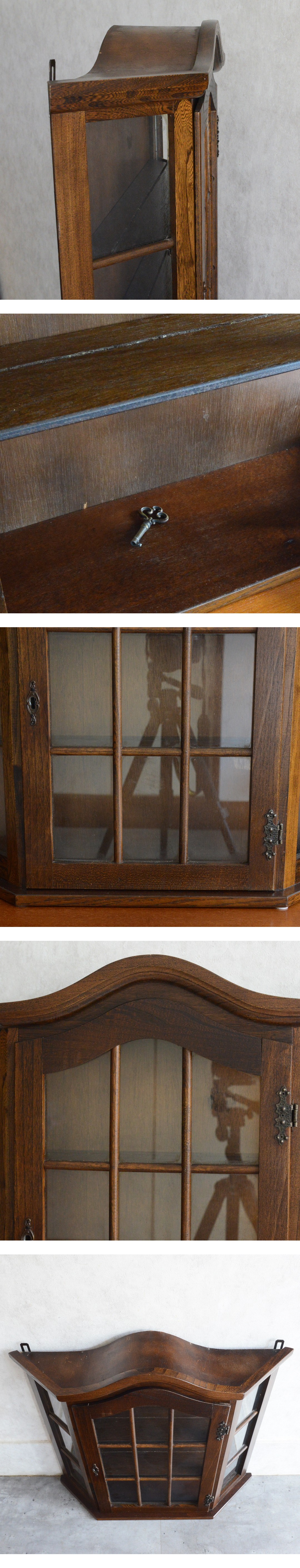 オランダヴィンテージ ウォール ガラスキャビネット 鍵付 オーク 飾り棚 ディスプレイ ガラスケース 壁掛け クラシック ミッドセンチュリー 收藏
