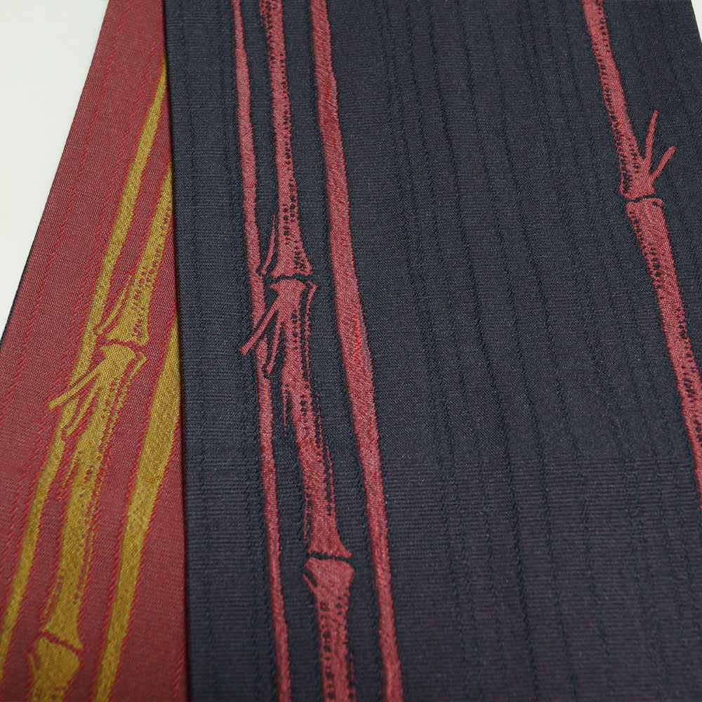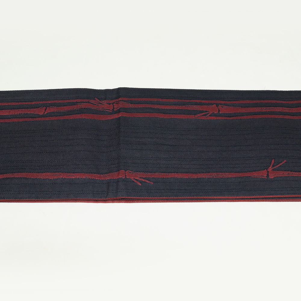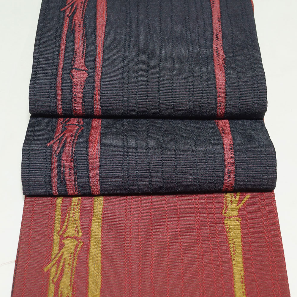 | 商品 説明 | 黒色系の地に縞に竹模様が織られた小袋帯です。裏地は同柄となっております。垂れ先・手先ともにかがっておりません。 |