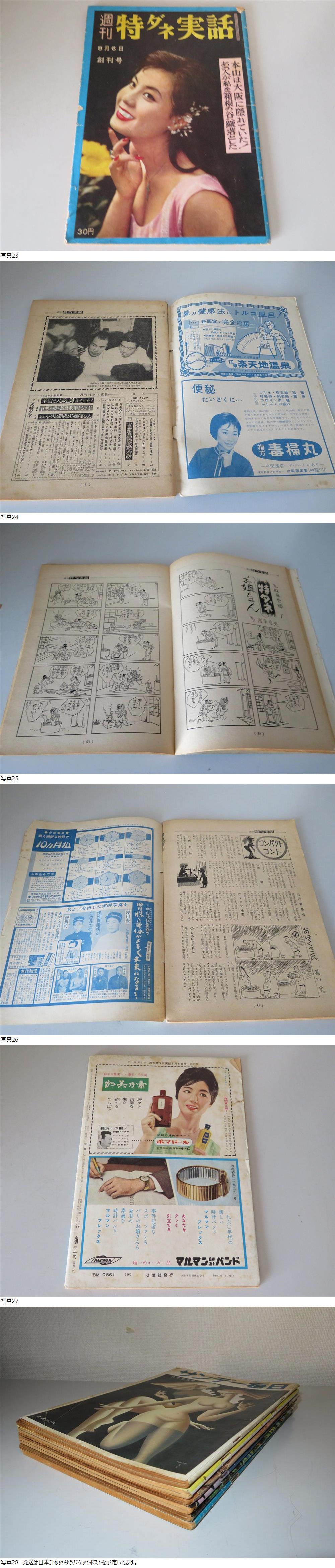 ※◎【本文の解説をよく読まれてご検討ねがいます。】 誠に申し訳御座いませんが24時以内に連絡、ご入金処理のできる方、および商品受領、確認後に取引ナビにて早急に「受取連絡」のできる方のみ入札願います。 また、評価が新規の入札者様は入札の際、質問等で予め連絡ください。事前連絡がない場合はこちらで入札の取消(削除)を実施しますことを予めご了承願います。 商品名 :★ 昭和レトロ 週刊朝日 サンデー毎日 週刊読売 週刊特ダネ実話 6冊 【現状ジャンク品(欠損・イタミ・欠落等有り)】★ 付属品 :なし。 商品詳細 :昭和30~35年発売の週刊誌6冊一括を現状ジャンク品でお願いします。 長期保管による経年劣化(ヤケ、ヤレ、シワ、めくれ、破損、欠落)等がありますがなんとか読むには問題なさそうです。 不要のため処分します。他に見落し等はご容赦願います。 何方かご興味、必要のある方宜しくお願いします。 外観の詳細は商品説明欄に写真をアップしましたので参照願います。 当方禁煙者ですのでタバコ臭はございません。 当該商品の内容については答えられない場合がありますので予めご了承下さい。 それでもご不明な点等がございましたら答えられる範囲でお答えします。 説明文の理解力の無い方、思い込みの激しい方はくれぐれも入札しないで下さい。 ほかの新品等保証の有るものをお探しください。 説明文をよく読まれた上、入札頂けます様お願い申し上げます。 入札終了間近のご質問もお答えできませんのでご了承下さい。 発送方法は日本郵便のゆうパケットポスト等を予定してます。 以上宜しくお願いします。 |