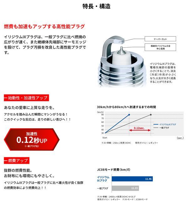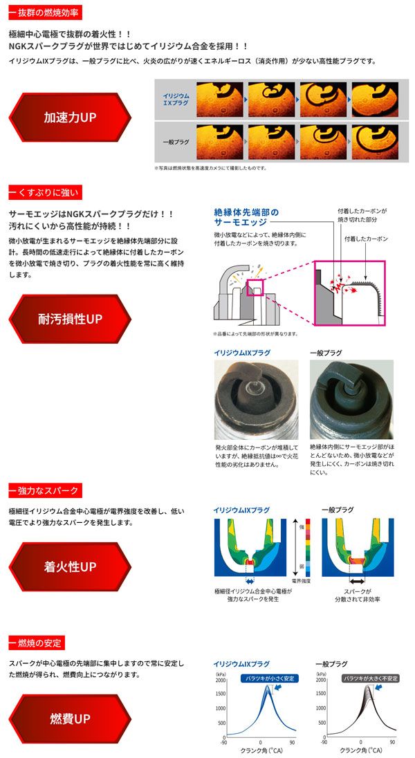 燃費も加速もアップする高性能プラグイリジウムIXプラグは、一般プラグに比べ燃焼の広がりが速く、また絶縁体先端部にサーモエッジを設けて、プラグ汚損を改良した高性能プラグです。