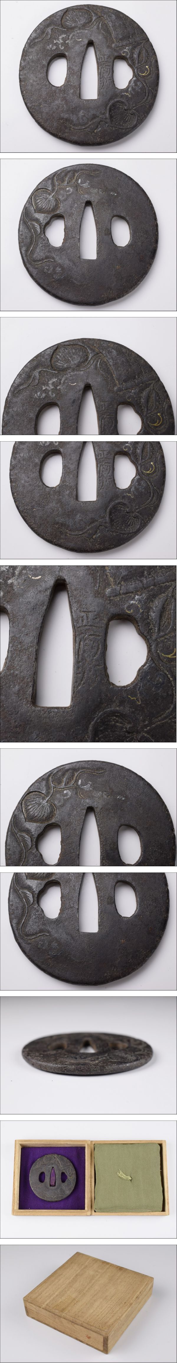 | 品 名:正阿弥 銘 時代 武具 鉄地 葵図 象嵌 鍔 刀装具 寸 法:幅 7㎝×6.7㎝ 厚み 5㎜ 総重量:98g 状 態:経年による汚れあり。 | |||
