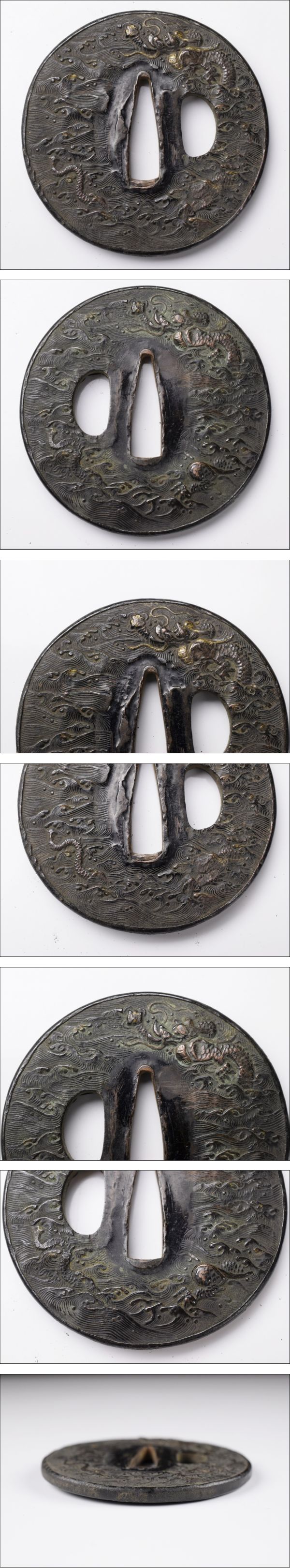 | 品 名:時代 武具 赤銅 波龍図 鍔 刀装具 寸 法:幅 7.1㎝×7.1㎝ 厚み 6㎜ 総重量:132g 状 態:経年による汚れあり。 | |||