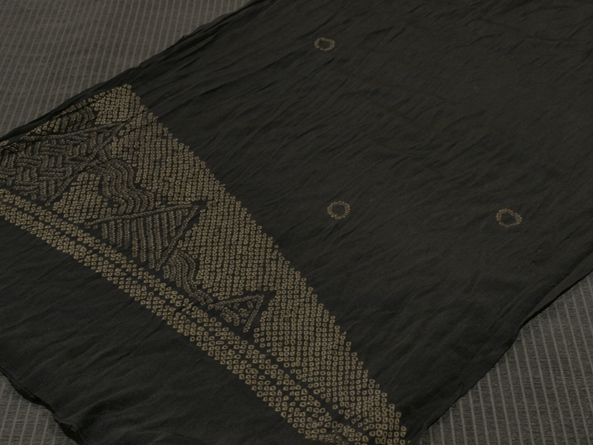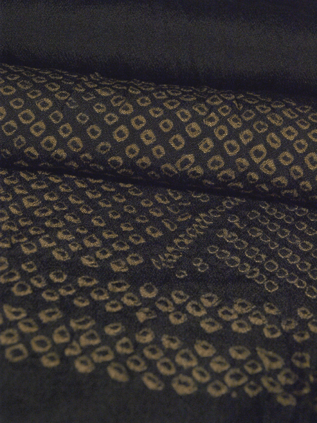 黒色の地に、絞りで網干(あぼし)のある水辺の文様が施されている、縮緬の男性用の兵児帯です。 昭和初期ごろにつくられたと思われるアンティークのお品です。やわらかでふんわりとした手ざわりのシボのこまかな縮緬地です。 画像のとおり、絞り部分は変色している感じがありますが、判別はつきません。中央付近のへり直近に長さ約 1cm の裂けが 1 か所あるほか、直径約 5mm-1cm のうすよごれがちらほらとあります。そのほかに目につく大きなしみやよごれ、褪色などのダメージはないので、裂けを繕ってしまえばお使いいただけそうですが、状態ランク=「D」のご着用対象外、リメイク素材用とさせていただきます。 |