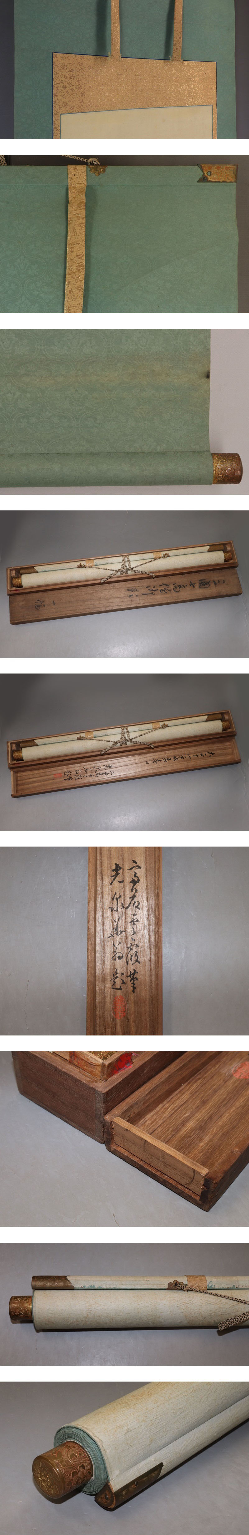 仏画【三国七高僧御影】 本紙は、染み、軽い皺、ヤケがあります。 表装は、染み、汚れ、軽い折れ、皺、虫食、金具に錆、軸先と箱に傷みがあります。 【サイズ】 作品 横約41.5cm×縦約115cm 表装 横約58.5cm×縦約196cm |
