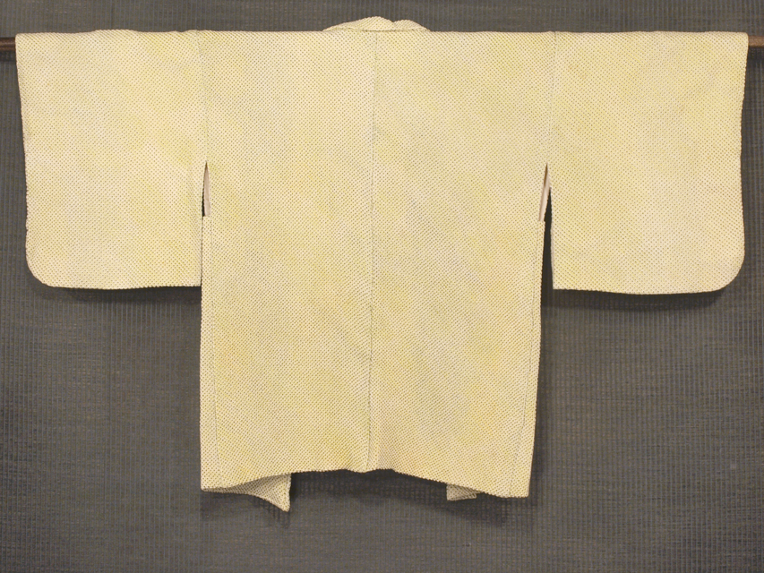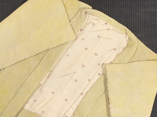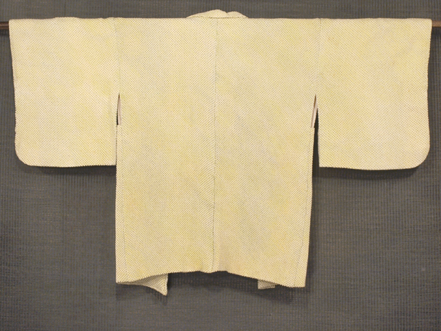 全体的な印象として濃淡のぼかしのある淡い緑黄(りょくおう)色の地に、総絞り染めで、鹿子(かのこ)の文様が施されている綸子の羽織です。 淡いライムイエローといった感じのめずらしさのあるお色目です。とても絞りの深い、最上質の絞りです。小梅の散らされた羽裏も小粋です。 ユーズド品としてはいますが、使用感は感じられません。左前袖のたもとに直径約 2mm のうっすらとした黄変が 1 か所、右前後袖に直径約 1-5mm の薄めの黄変が数か所程度あります。いずれのダメージもぼかしにまぎれてあまり判別はつかないので、気にされない方であればご着用は可能と思われますが、状態ランク=「D」のご着用対象外、リメイク素材用とさせていただきます。 |