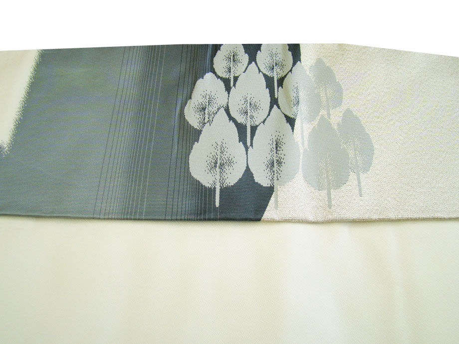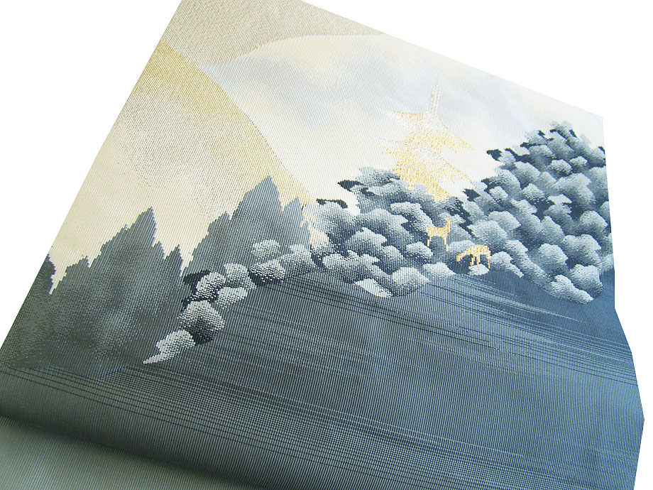 | 商品説明 | しなやかな結び易い西陣織のなごや帯。 練色地に灰色、墨色、金色、銀色、鼠色等の三笠山柄。 たいこ柄。 |