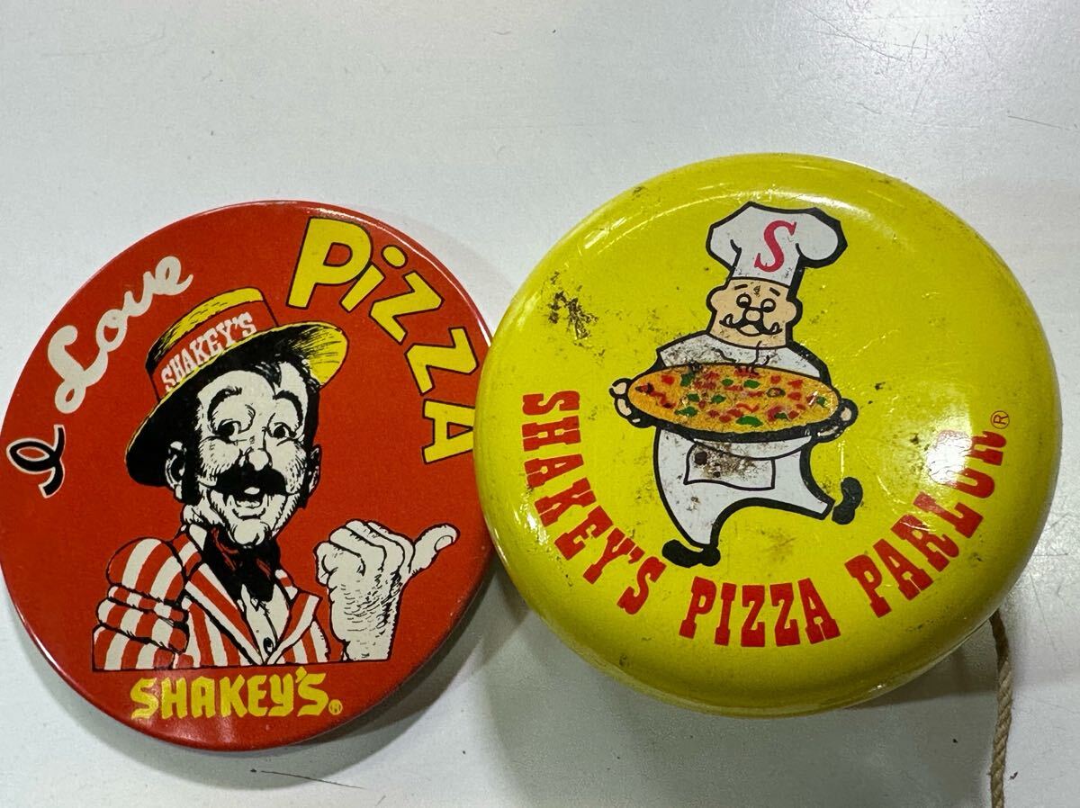 ●古いシェーキーズのノベルティの缶バッジとヨーヨーのセットです。
