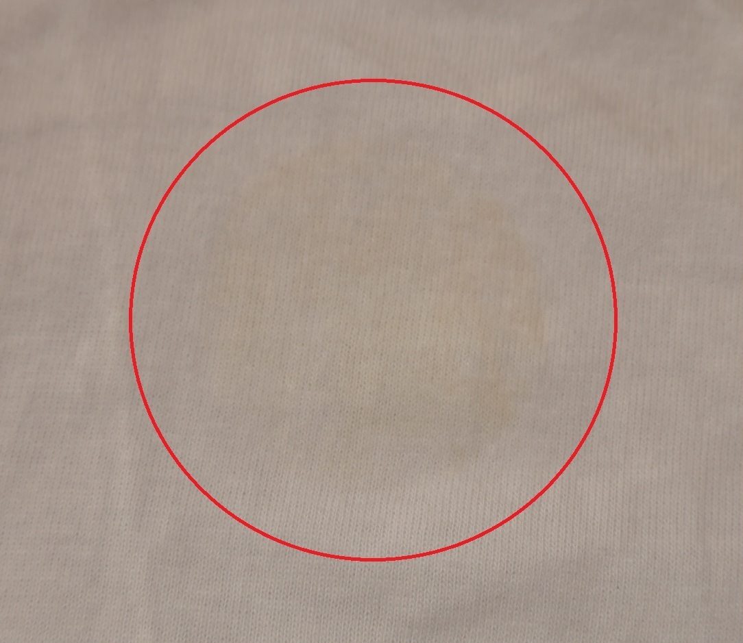 右肩部に丸いシールが貼ってあったのですが取れてしまっていて薄っすらシールが貼ってあった跡(写真7枚目)が残ってます。
