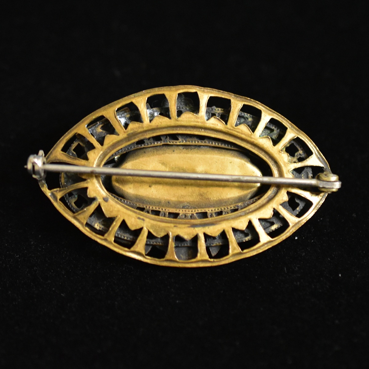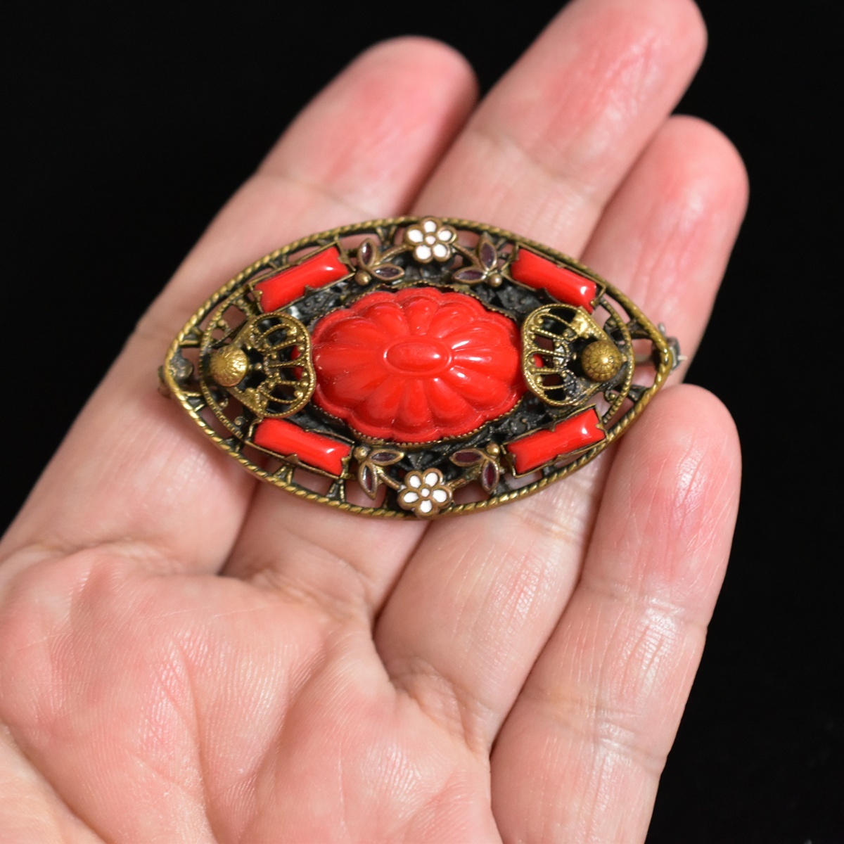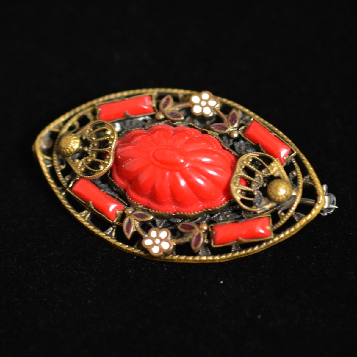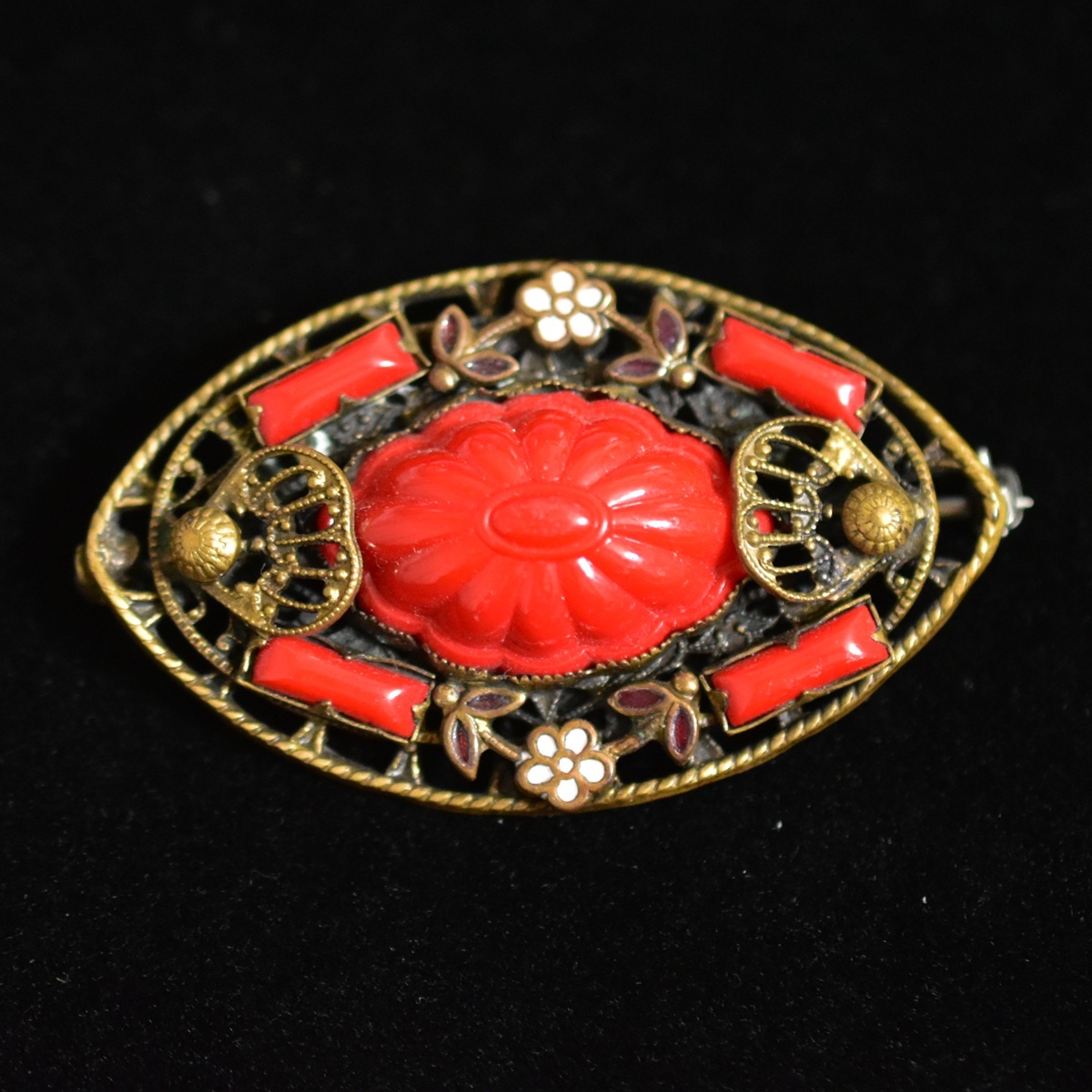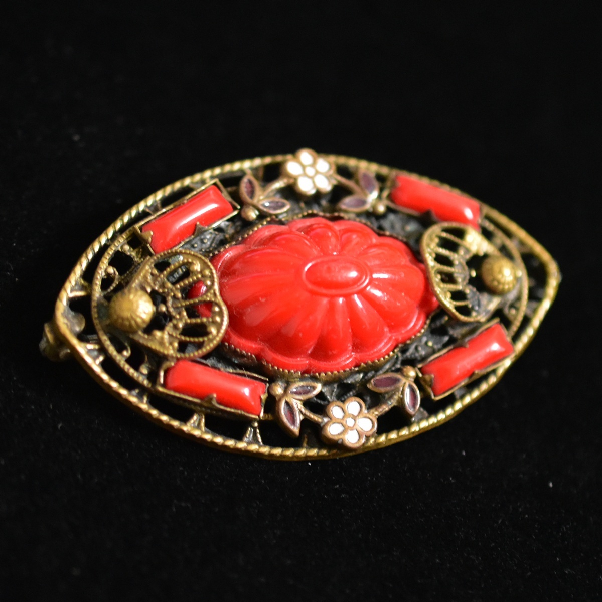 アンティーク チェコ製 赤珊瑚風ストーンとエナメル細工のブローチ 本物保証 收藏