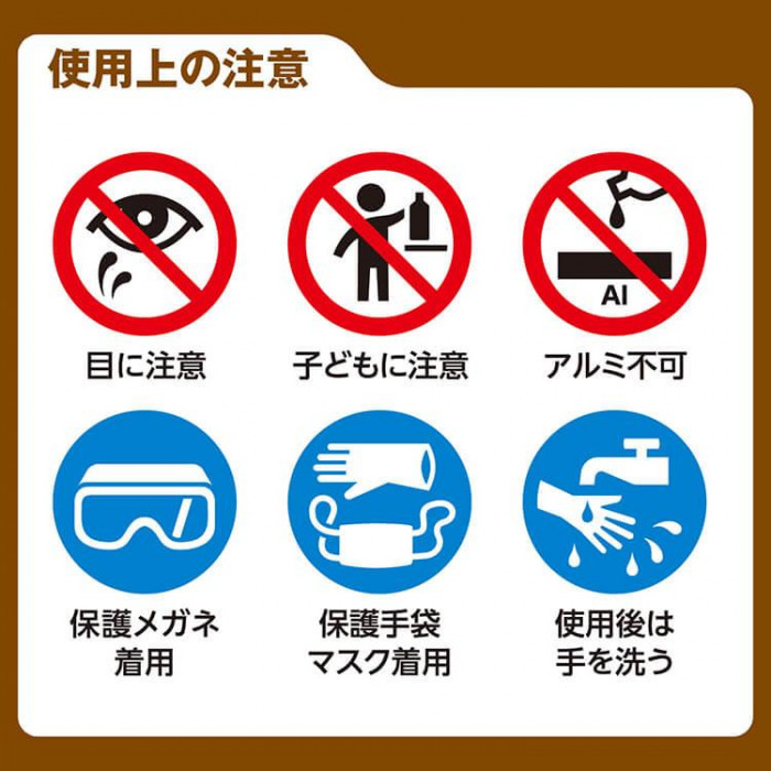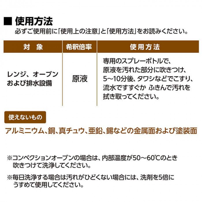 | ガスレンジ、フード、グリスフィルターなどのこげついた油汚れの洗浄に最適です。加熱調理機器や排気設備などにこびりついた油汚れを、泡持ちのよい泡で強力洗浄します。専用ボトルに詰め替えてのご使用が便利です。 ※ご使用にはカップ&ノズルが必要です。 ※アルミニウム製品にはお使いいただけません。 ※用途以外には使用しないでください。 ※小児の手の届かないところに保管してください。 ※他の薬剤・洗浄剤とは混ぜないでください。 ※作業時は、必ず保護メガネ、マスク、炊事用ゴム手袋を着用してください。 ※詰替える場合、清浄で乾燥した専用のプラスチック容器にその商品名、使用方法、注意事項を明記して使用してください。 ※キャップを開けるとき液が飛び出す恐れがあります。また容器を移動するときはキャップをしっかり閉めてください。緩んでいると、液が飛び跳ねて目や皮ふにつく恐れがあります。 ※壁や天井など、顔より高い箇所に使う場合、液の飛び散りや垂れを防ぐため、液をスポンジにつけて使用してください。 ※ガラスやホーロー製品には、本品を長時間接触させないでください。 ※アルミニウム、銅、真チュウ、亜鉛などの金属面および塗装面には使用しないでください。(グリスフィルターにはアルミニウム製のものがあるので注意してください。) ※使用後の容器は洗浄処理してください。 |