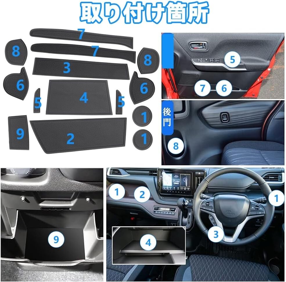 【メリット】振動により落ち防止、車内高級感アップ、傷つき防止、水洗いOK、自分吸着性に優れた素材、スズキ ソリオ MA27S MA37S SOLIO ラバーマット 専用設計のインテリアラバーマットです。 純正ドアポケットやドリンクポケット等はプラスチック素地となっており爪や小物などで傷つき易いため当マットでパネル保護&異音防止・ドレスアップ可能です。今まで直接置いていた小物やスマートフォン等が当マットで保護でき、缶ジュース等、走行時の振動によるカタカタ音等防止やパネルの傷防止にもなります。
