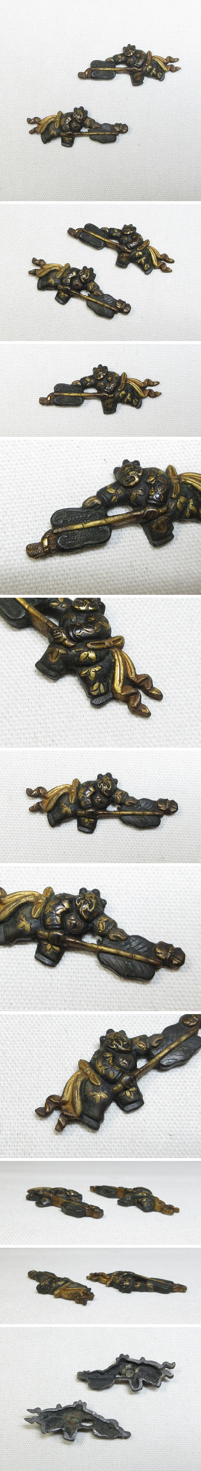 【B0418b】武具 刀装具 小道具 時代物 細密細工 銅地 金色絵 容彫 唐子団扇図 目貫 收藏