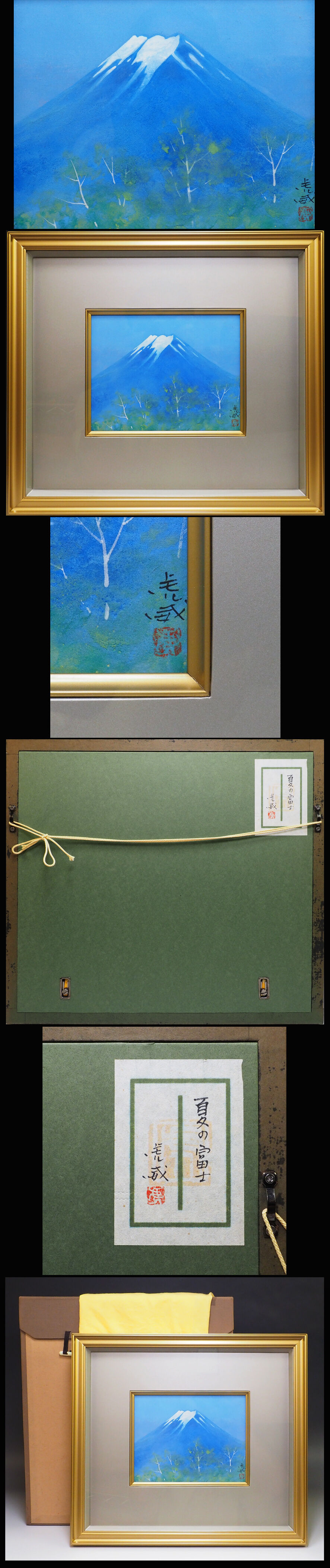 ![]() 中嶌虎威の爽やかな富士山を描いた日本画 「夏の冨士」 です。 作品サイン、共シール付き。 【状態】 直筆・日本画 作品は目視で確認できるような欠点はなく美品です。 額も当てキズが数か所ありますが良好です。 詳細は写真でご判断下さい。 タトウ箱・黄袋付き 【サイズ】 作品窓サイズ:約 縦 14cm × 横 18cm(0号サイズ) 額装サイズ:約 縦 23.5cm × 横 37.5cm こちらの作品は真作保証の安心頂ける作品であることをお約束いたします。 不明な点は、入札前に質問等でご確認下さい。 中嶌虎威 1943年 東京に生まれる 1967年 東京藝術大学日本画科 卒業 1968年 第23回院展春季展 初入選 1972年 第16回シェル美術賞展 2等賞 1984年 第59回院展 松岡美術館買上げ 1987年 茨城県展 永田春水賞 1993年 第48回春の院展 外務省買上げ 茨城県展 木村武山賞 1997年 第52回春の院展 外務省買上げ 2009年 第45回記念亜細亜現代美術展 フジテレビ国際賞 2010年 第46回亜細亜現代美術展 亜細亜美術交友会優秀賞 | |||