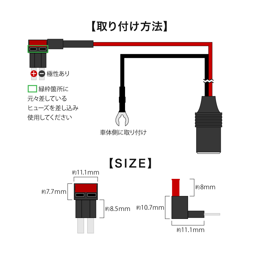 内容 | シガーソケット付マイクロ2電源取り出しヒューズ、10Aヒューズ | 入力電圧 | 12V |