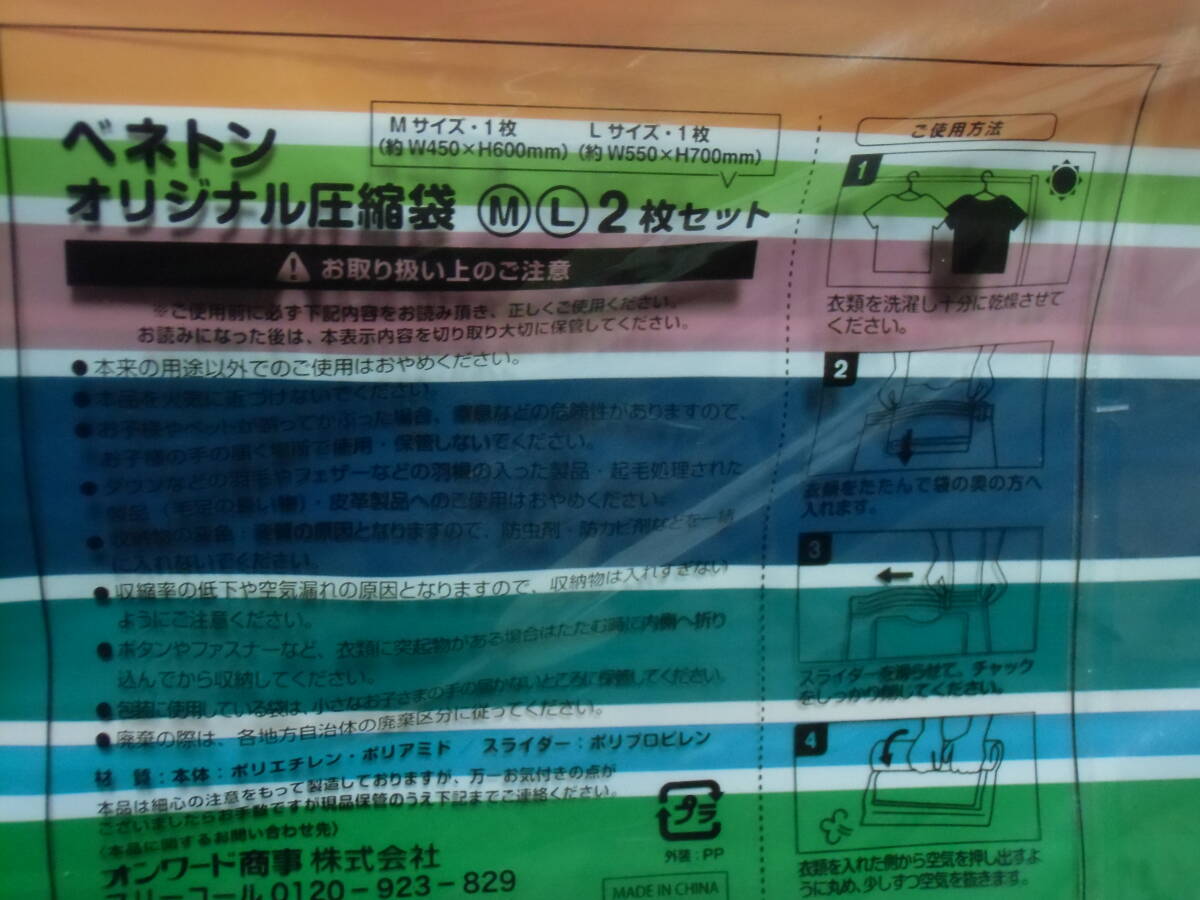 1.ベネトン オリジナル圧縮袋 ML 2枚セット (M:W450×H600mm/L:W550×H700mm)