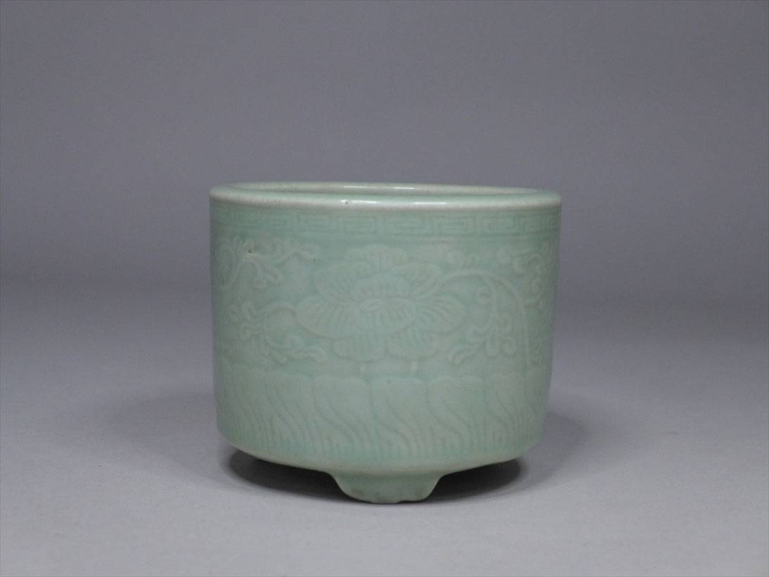 中国古玩 唐物 青磁陽刻牡丹花文三脚香炉 三足香炉 検/天龍寺龍泉
