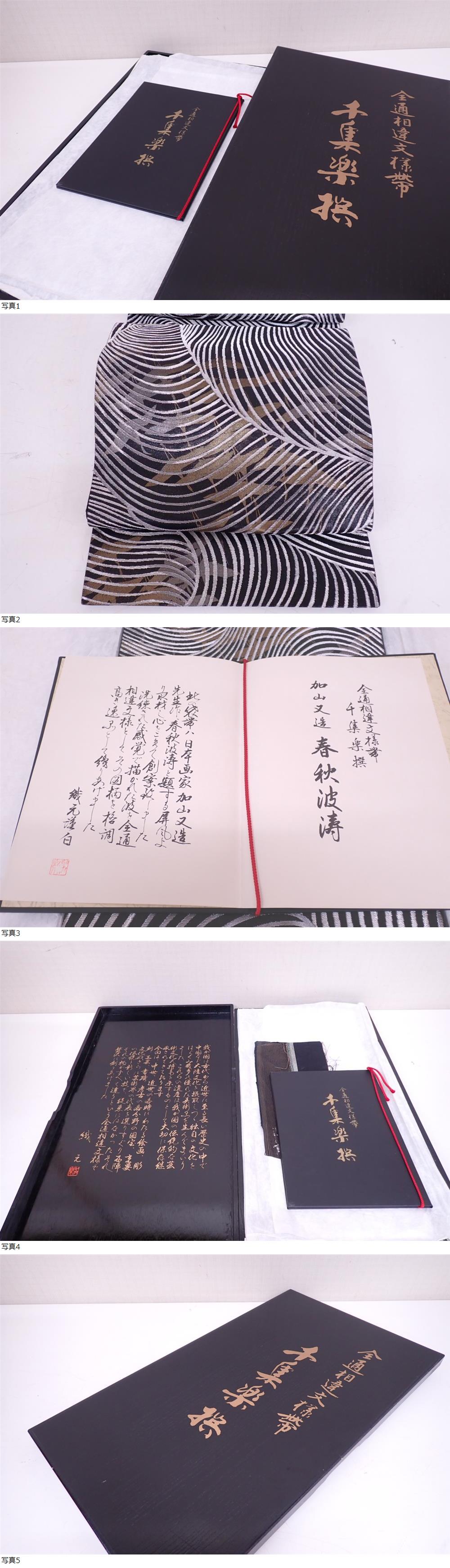 最高級 西陣名門 聚楽 じゅらく謹製 日本画家 加山又造 春秋波濤 全通相違文様帯 千集楽撰 袋帯 金糸 銀糸 | ||||