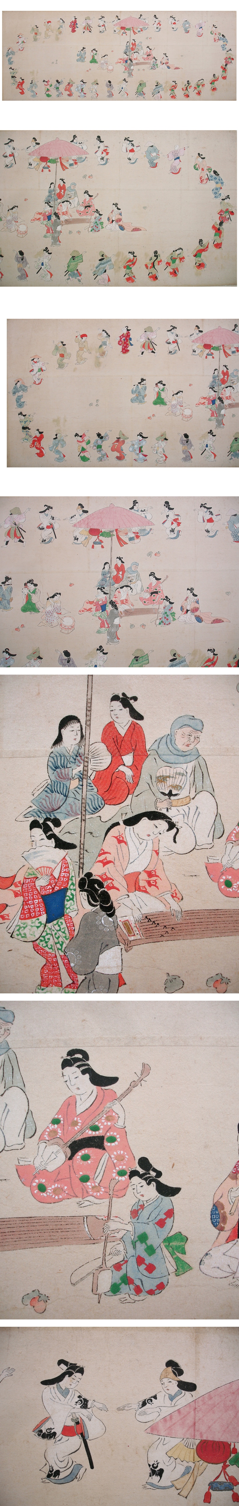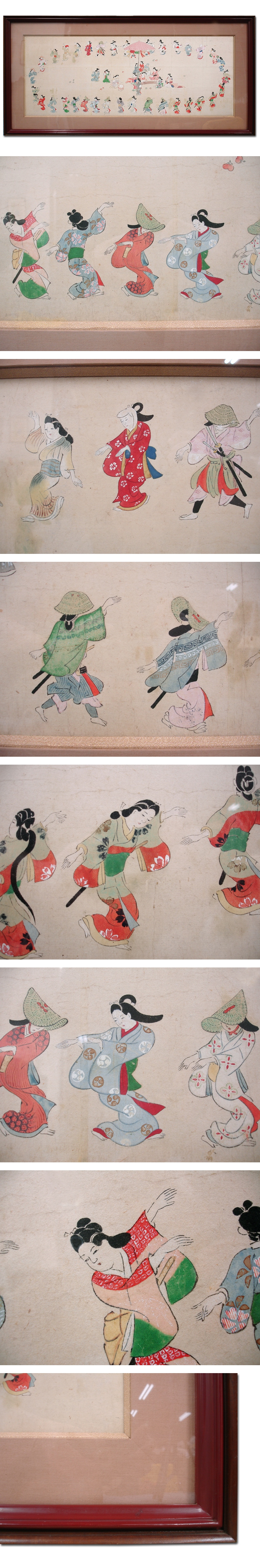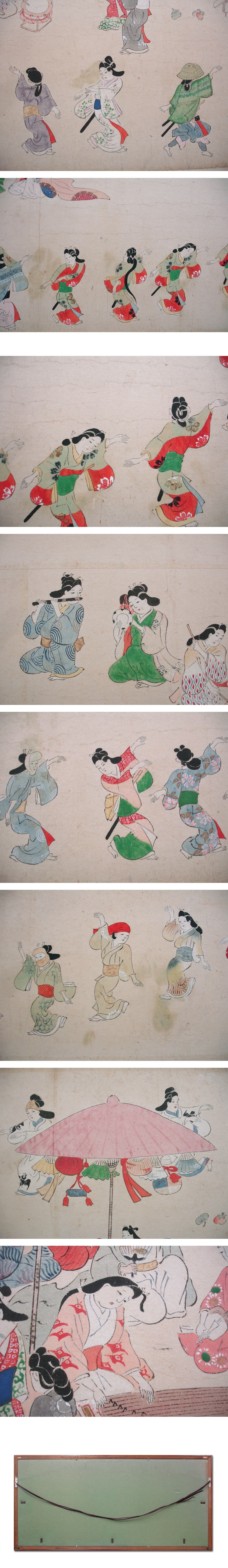 慶應◆江戸時代肉筆古画 菱川師宣「変化図巻(輪踊図)」の模写作品 忠実に写された肉筆画 紙本彩色 額装 盆踊り風俗図浮世絵 收藏