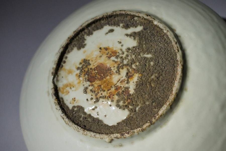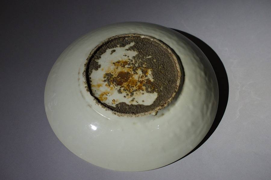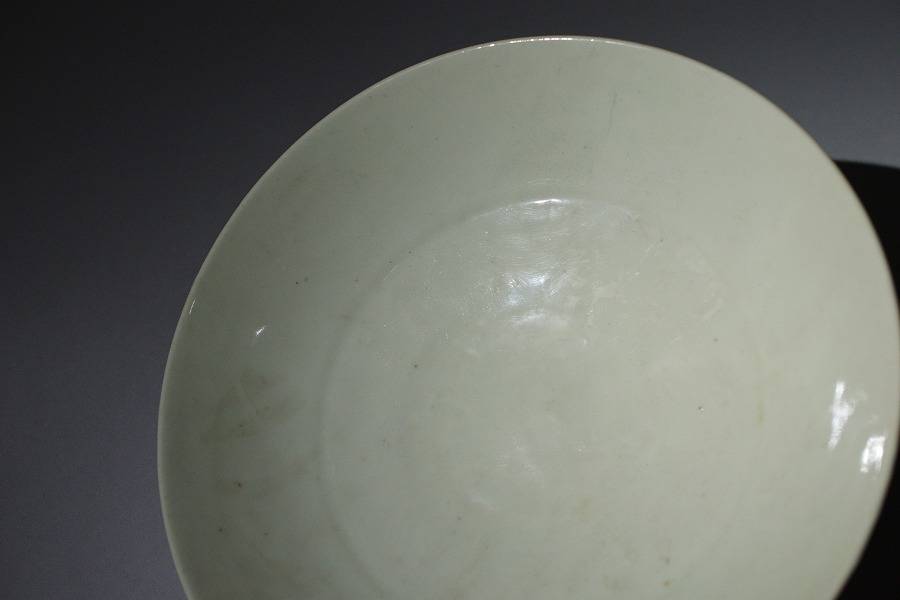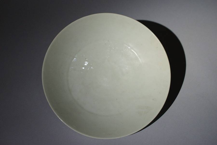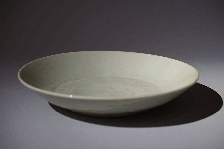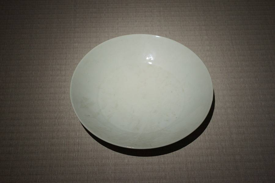 珍しい白呉須の大皿です。明末の章州窯(正確にはさんずいへんに章)の作品です。大皿といっても26センチほどで、使い勝手のよいといえる寸法。絵付けがないぶん、どんな料理を盛っても引き立つでしょう。古渡り伝世ですが傷気もなく、堅牢な呉須なので実用性抜群です。また、ひっくり返すと高台の荒々しい景色も楽しめます。江戸期の黒い桐箱に収まりますが、経年で痛んでおりますので、おまけ程度にお考えください。