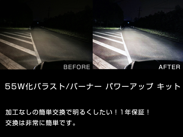 商品説明 | 純正が暗くてお悩みの方におすすめ 純正D2バルブが暗いと感じるユーザー様に更なる明るさ(視認性)を実現!! 視認性の大幅なUPで運転もスムーズに、抜群明るさで同じ車種に差を付けれること間違いなし!! 35Wの純正バラストを55Wバラストに交換して 明るくするHIDキットです。 加工は不要なので、簡単に交換が可能です。 車検にも対応しているので、安心して交換できます。 取り付け方法 ・ヘッドライトを外し、既存の純正HIDバルブとバラストを取り外す。 ・純正に接続してあった配線をそのままパワーアップキットに繋ぎ直し、バラストを取り付ける。 ・バルブも純正バルブと同じように取り付けて、ヘッドライトを元に戻す。 ※タイトルや適合は車種と適合の一部を掲載の為、必ずご購入前に現車にてご確認をお願いします。 ※非常に強い発光をしますので、お取付の際は、直視なさらないようにご注意下さい。 |