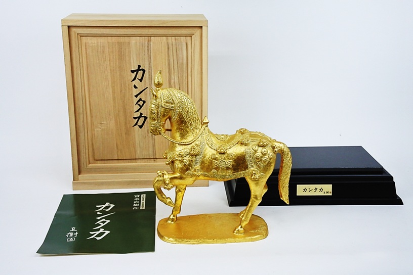 逸品 文化勲章受章 富永直樹 カンタカ 金箔 ブロンズ 本金箔貼り 彫刻 干支 午 金 馬 神馬 開運 縁起物 勝負運 競馬 台座 木製台黒御影石付 收藏