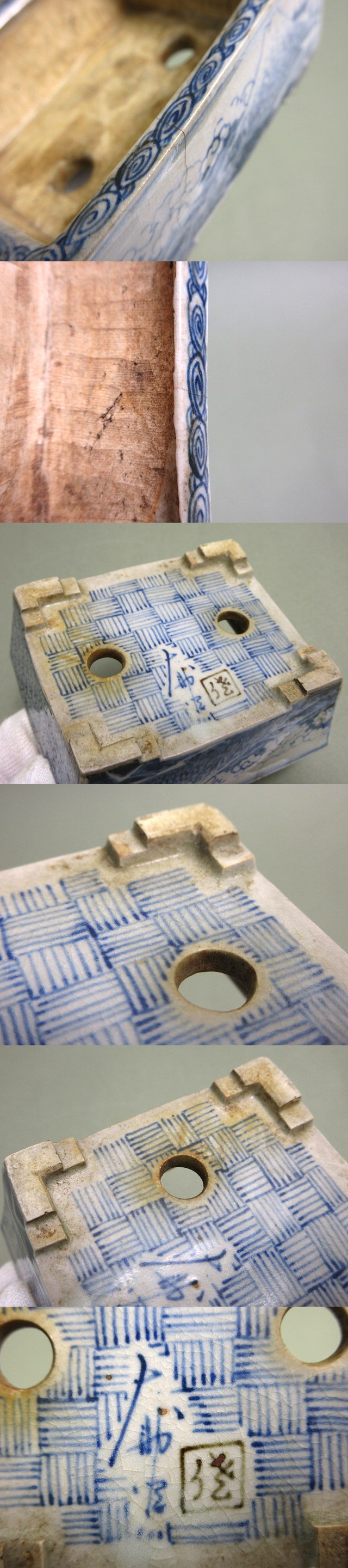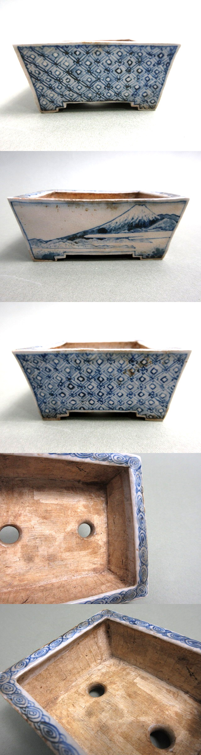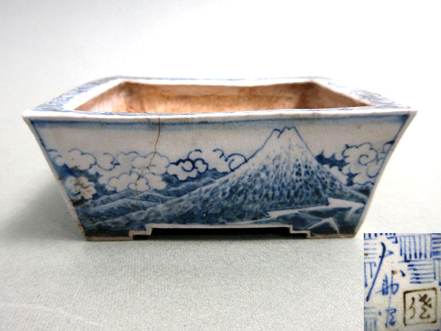 C732 佐野大助 染付 富士 盆栽鉢 間口約6cm×7.2cm 小品盆栽【説明欄に詳細写真有り】