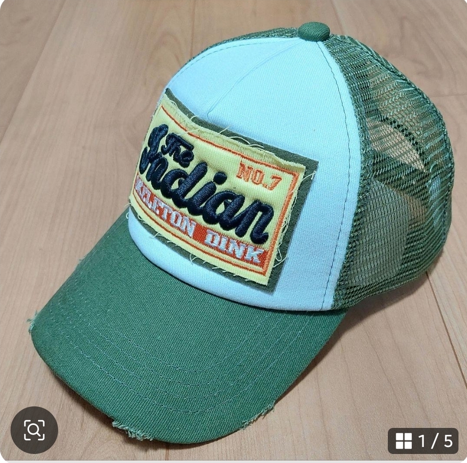 Indian メッシュキャップ ホワイト/グリーン 刺繍ロゴ USED バイク 收藏