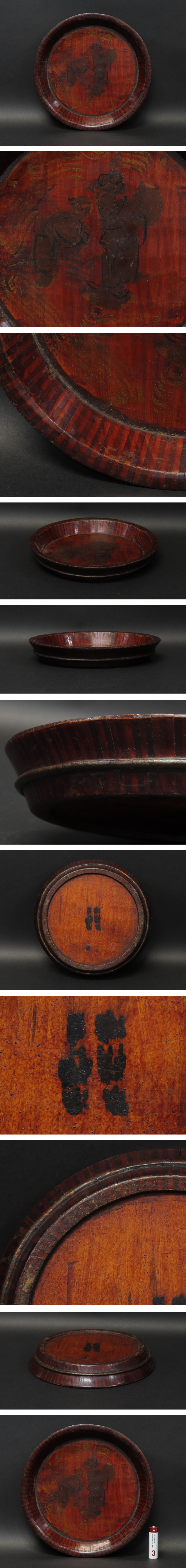 【月】【骨董 茶道具30】古寄木煎茶盆 中国人物図 在銘 直径20.5cm 重さ193g / 紫檀 唐木 唐物 古玩 煎茶道具 收藏