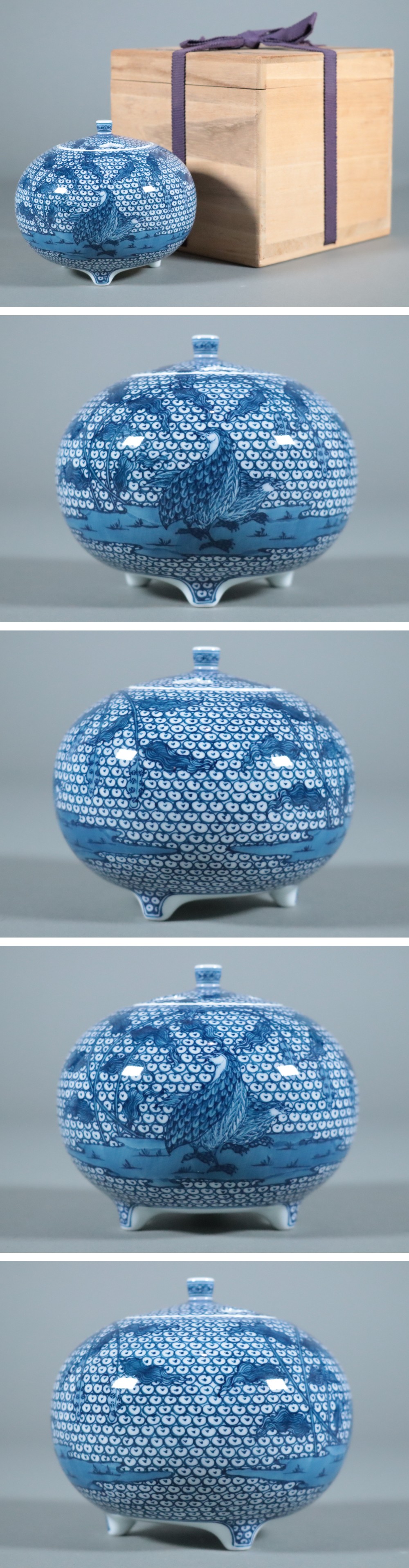 伝統工芸 有田焼 天才陶芸家 葉山有樹 / 染付 細密絵付 鶉画 香炉 共箱 / 香道具 香爐 古伊万里 伊万里 美術品 收藏