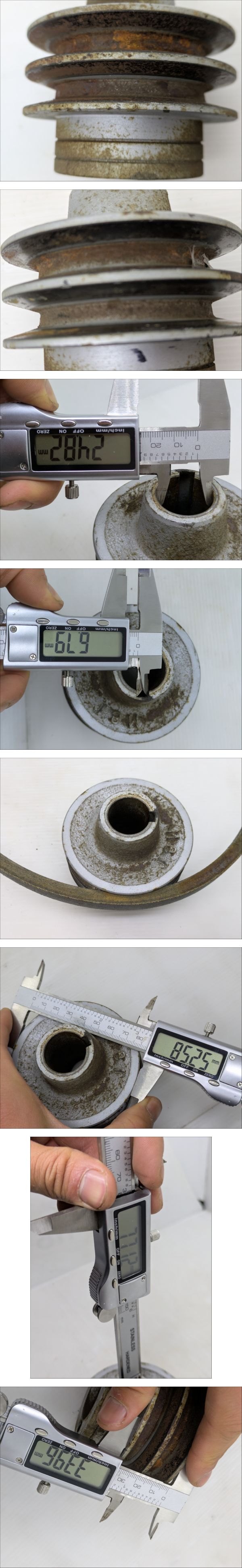 | ●●最後まで読んで下さい●●納得した上でご入札してください●● ●大型機械用のアカウントは**こ ち ら**です。 ●当方の別出品物を同時購入しても送料分安くなりません。 ●発送料金は入札ボタン付近にあり、沖縄、北海道、離島以外一律です。 ●塩尻市から発送します。 ●離島発送はできない場所がございますので、事前にお問い合わせください。 ●発送日は月、水、金、日です。急ぎの場合はご連絡をお願いします。 ------------------------------------------------------------------------------------------- ●2連のプーリーです。 ●Aベルトです。 ●軸 径:約Φ25mm ●鍵 幅:約7mm ●プーリー外径:約Φ85mm ●全体 厚さ:約77mm ●ベルト部 厚さ:約34mm ●書いたインクは消さずに発送します。 ●素人寸法のため、測定誤差があります。 ●中古品のため、サビや汚れがあります。 ●錆は各自で取り除いてください。 ●現状写真の通りのまま送ります。 ------------------------------------------------------------------------------------------- ●下の方にも画像がございます。※たまに写真の枚数が不足していて画像がない場合があります。 ●落札後、ご指定配達の時間帯がある場合はあらかじめご連絡してください。 | |||