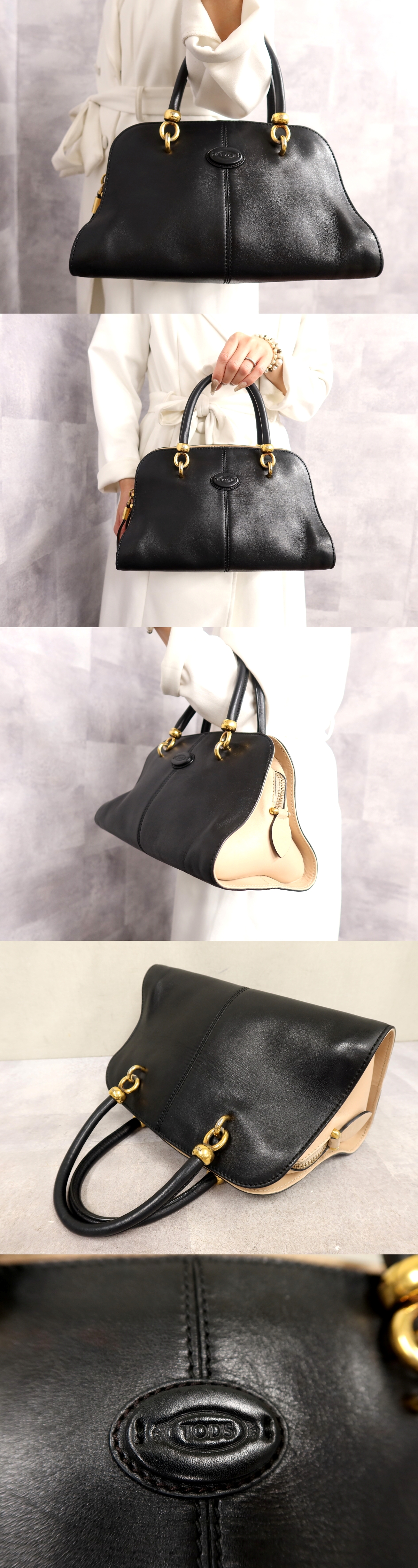 ●超美品●TODS トッズ●ロゴ型押し●カーフ レザー 本革●ハンド バッグ●黒 ピンクベージュ●ゴールド金具●ヴィンテージ●Js63405 收藏