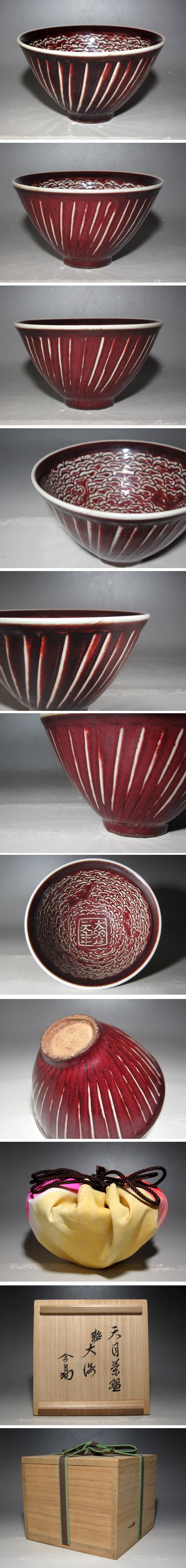 天目茶碗「大海」です。 時代を感じる素晴らしい逸品です。 箱蓋裏に裏千家十四代淡々斎花押があります。 サイズ 直径13cm/高さ7.5cm(多少の誤差はお許しください) 状態 一見して疵やヒビ・直しは見られません。 骨董品という事をご勘案頂き、時代経過のスレや、小さな傷がある場合があるかもしれませんのでご承知置きください。 | |||