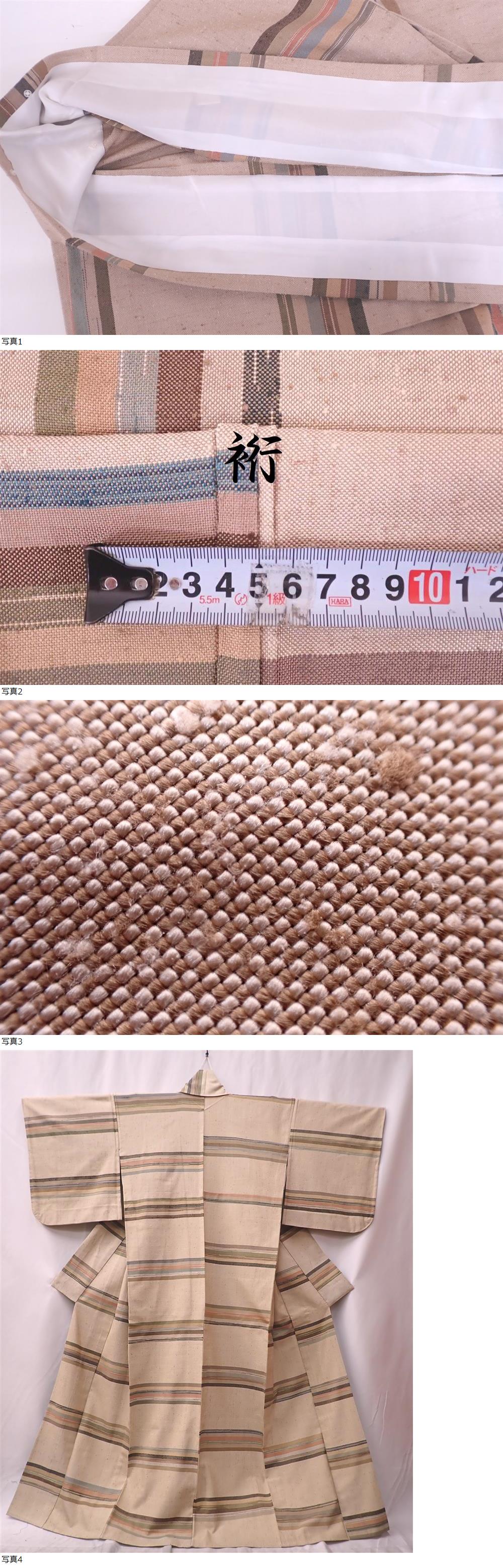秀品 ウールのお着物 身丈165.5cm(+3cm) 裄丈68.5cm 横段文 麻色 胴抜き 八掛正絹 カジュアル着 和装 和服 着物 P12135 收藏
