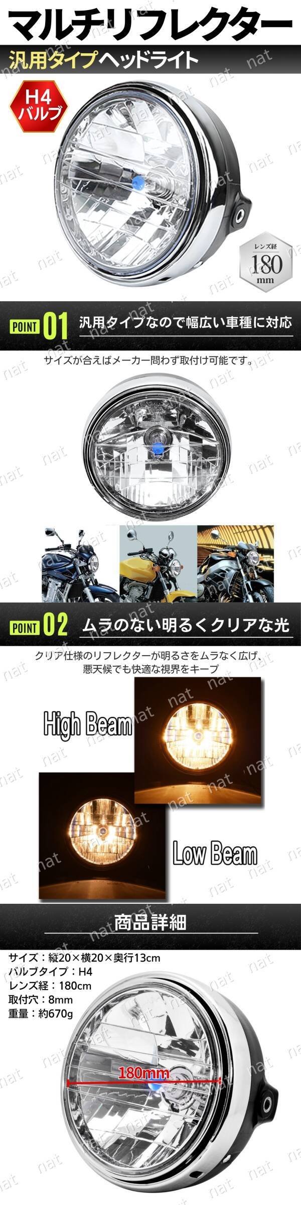 マルチリフレクター ヘッドライト バイク 汎用品 180mm/パイ H4 社外品 CB400SF CB1300SF VTR250 ホーネット250 XJR400 ヤマハ カワサキ 收藏