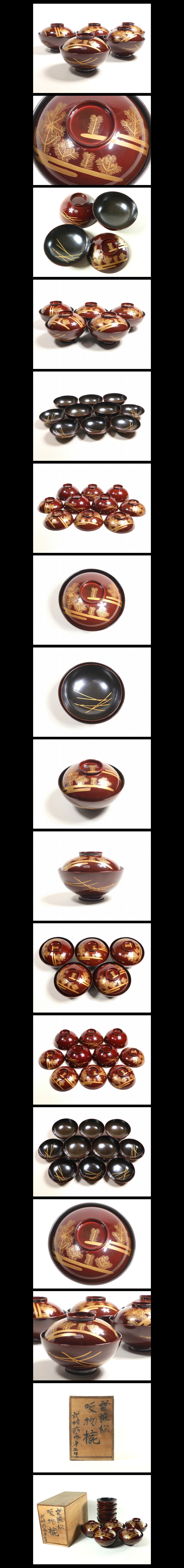 紅春慶のような美しく透明感のある紅溜の塗に内側は黒地、蓋表面には雲稚松、椀側面に松葉、蓋見返り黒地にも松葉の
