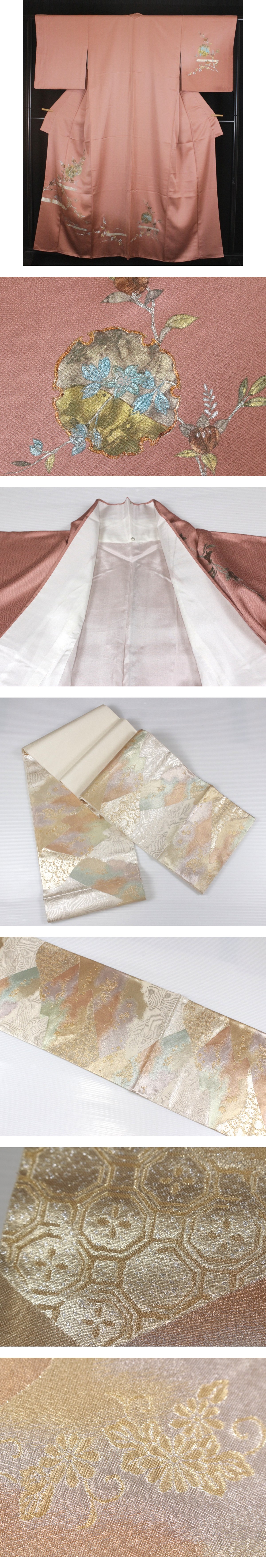 【正絹訪問着と袋帯】金彩加工 枝花文 雪輪文 霞文 裄:64cm e-135 收藏
