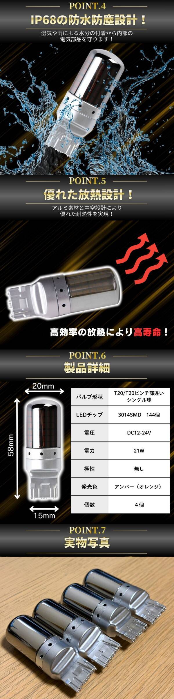 | ・形状:T20シングル(ピンチ部違い対応) ・カラー:アンバー(オレンジ) ・LED:3014チップ×144個 ・電圧:DC12V ・消費電力:約21W ・サイズ:全長 約57mm × 直径 約20mm(差込部 約16mm) ・防水等級:IP67相当 ・数量:4個セット | |||
