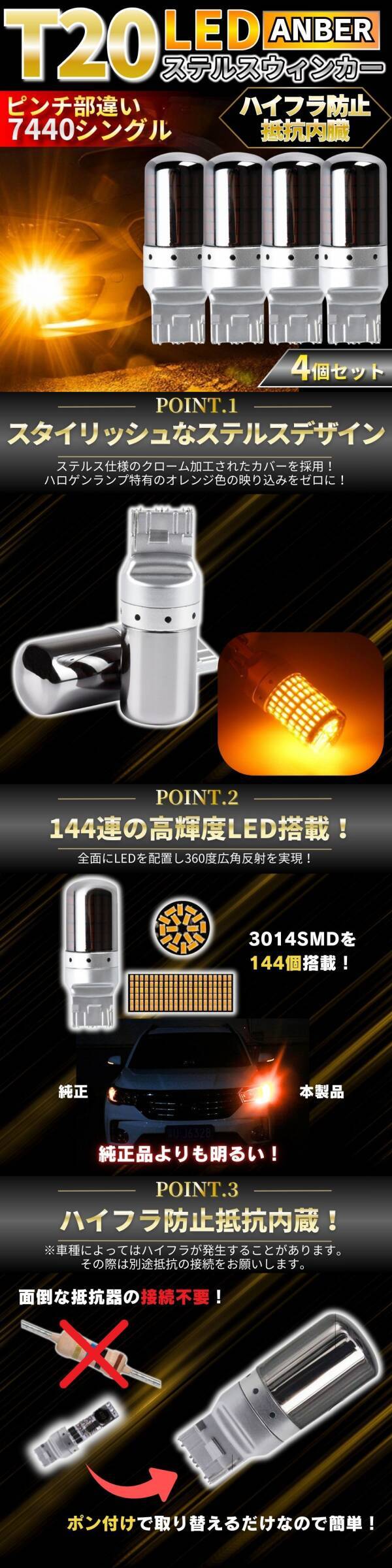 T20 LED ウィンカー バルブ アンバー 4個 ステルス ピンチ部違い ハイフラ防止 抵抗内蔵 ウェッジ 汎用 オレンジ 高輝度 爆光 キャンセラー 收藏